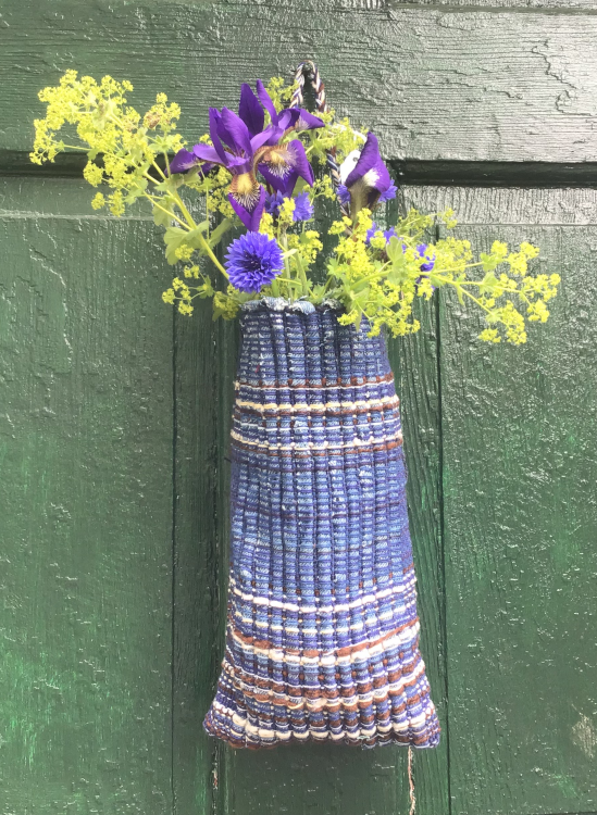 Made from sturdy cotton and recycled blue jeans. Ready for your bouquets or come by and pick up one already made. Can hang from a nail, hook or door knob.